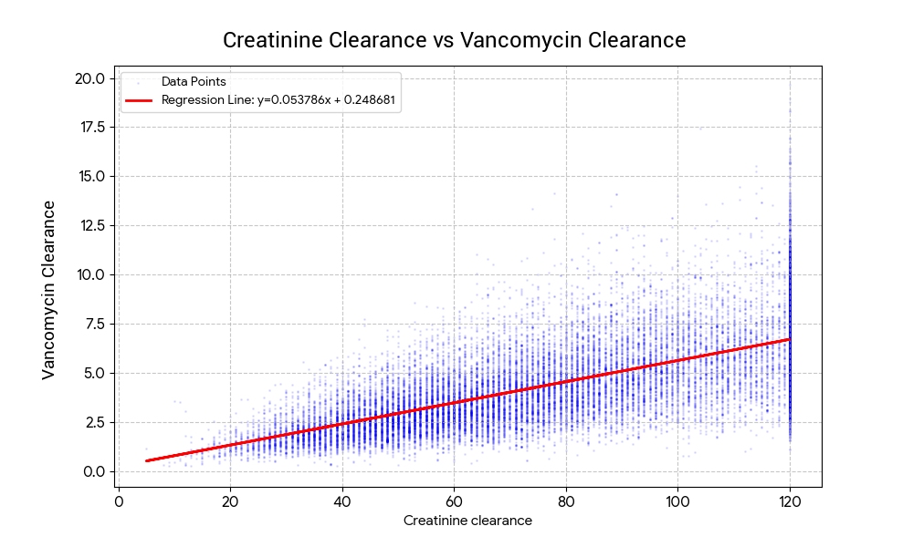 Regression analysis results: the relationship between Creatinine clearance (CrCL) and vancomycin clearance (VanCL) is defined by the following linear equation: