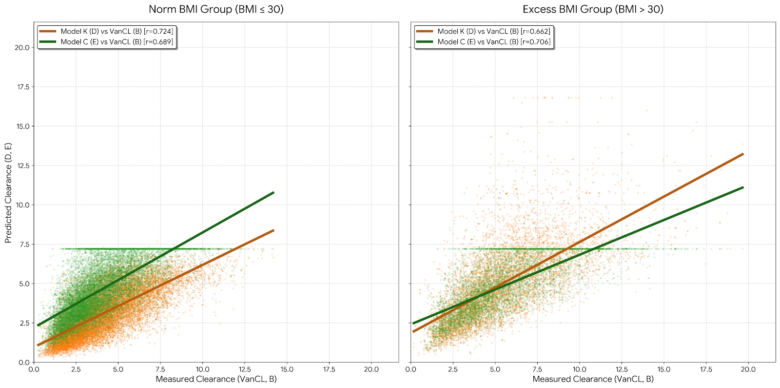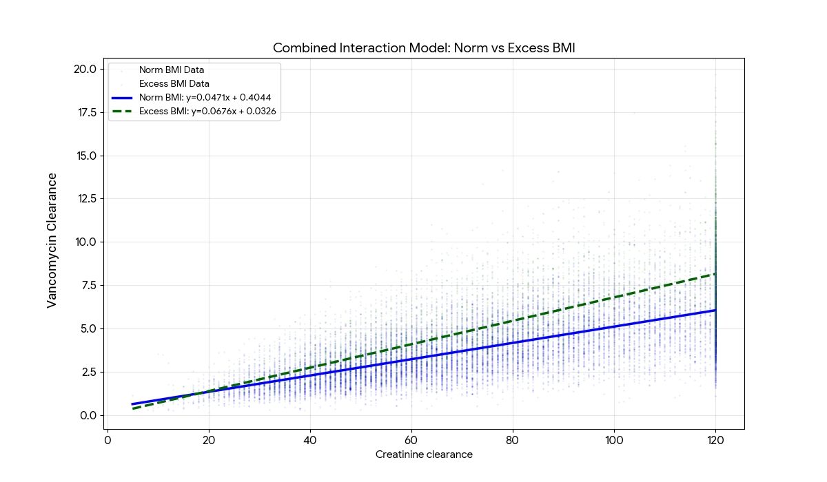 Our analysis shows that a one-size-fits-all modeling approach is flawed. For patients with a BMI <= 30, Model K (labeled “aggressive” in the app) is the statistically superior predictor of drug clearance. However, once a patient crosses the BMI threshold of 30, Model C (labeled “conservative” in the app) takes the lead.