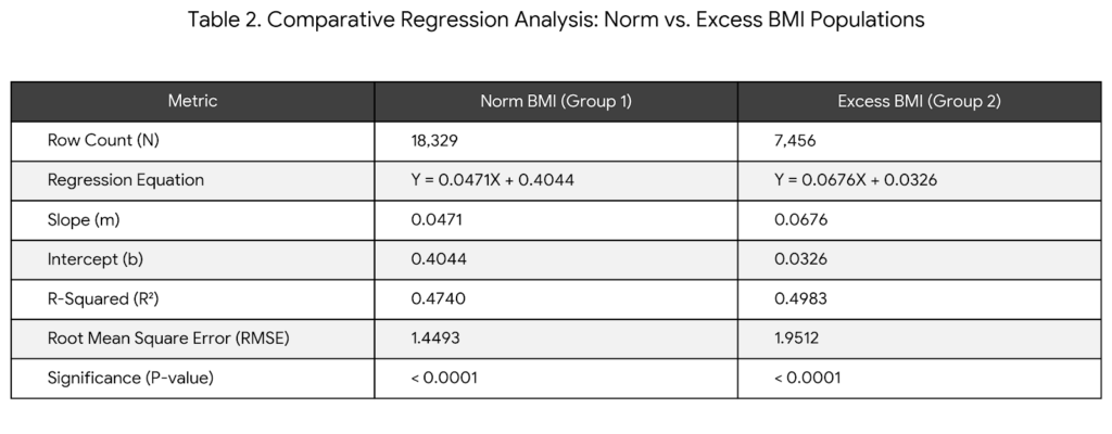 Group 2 fits the linear model slightly better than Group 1 (49.8% vs 47.4%). - Error Margin (RMSE):